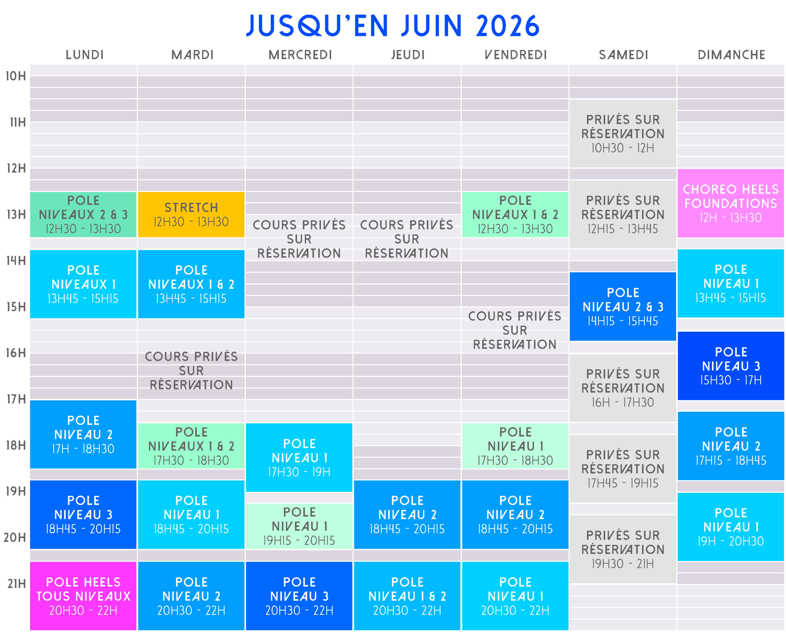 Programmation ponctuelle de cours ou d’événements, visibles directement sur la réservation en ligne (workshops de pole dance, chair dance, stretching, booty shake, floor work, renforcement…)